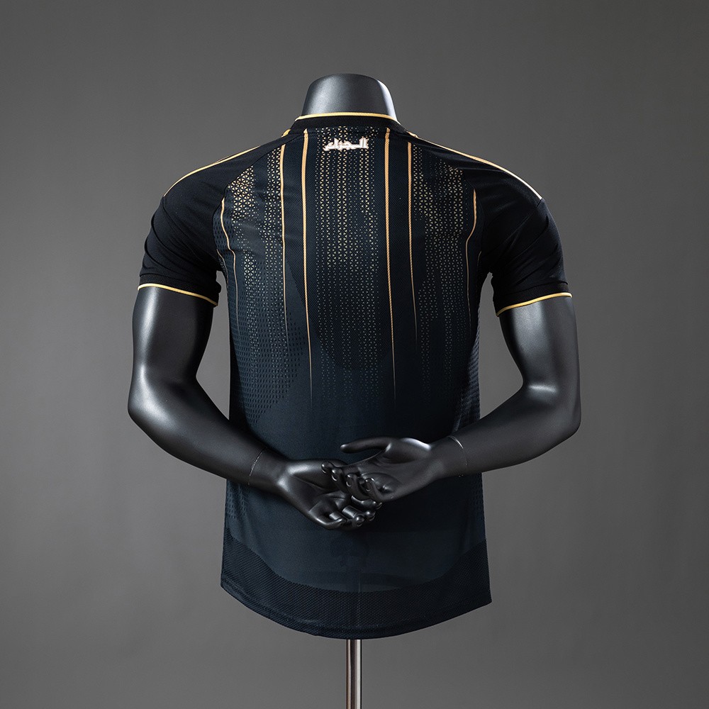 Algerie fotballdrakt i et stilrent svart design med gullfargede detaljer. Den mørke basen kombineres med vertikale linjer og subtile mønstre som gir drakten et moderne og dynamisk uttrykk.