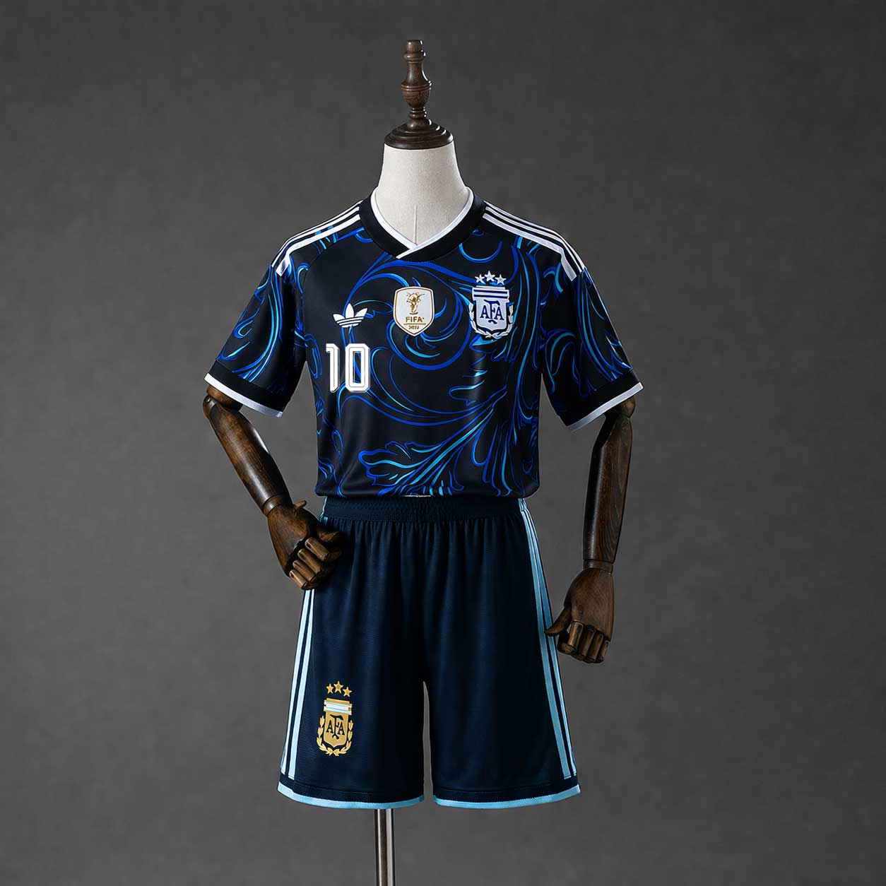 Drakten har en sort base med hvite logoer og lyseblå detaljer, som gir et kraftfullt og stilrent uttrykk. Det unike mønsteret er inspirert av Fileteado Porteño – en tradisjonell kunststil fra Buenos Aires.
