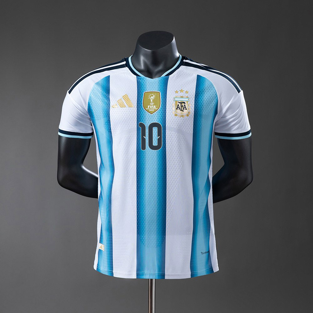 Den marineblå detaljeringen på skuldrene og ermene gir drakten et skarpt og kraftfullt uttrykk. Som den første drakten med Argentinas tredje stjerne, markerer den et nytt kapittel i landslagets stolte historie.