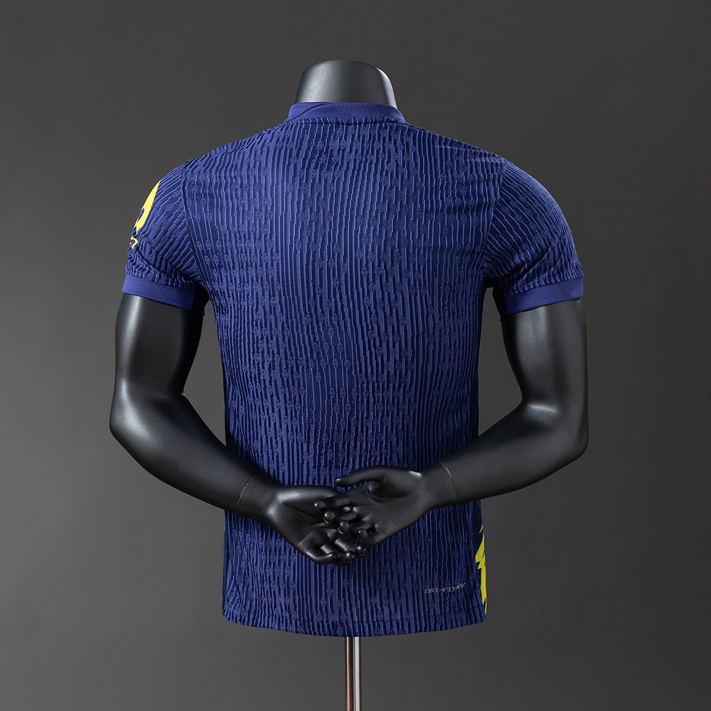 Et av de mest iøynefallende elementene er lyn-grafikken som løper langs sidene av trøyen. Den gir drakten en dynamisk, nesten elektrisk følelse i bevegelse, og understreker Atléticos kompromissløse spillestil. Gule logoer, klubbemblem og detaljer står skarpt mot den dype blå tonen og gjør designet både moderne og lett gjenkjennelig.