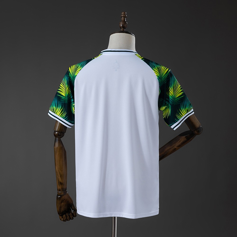 Brasil bortedrakt i hvit med grønne detaljer er et stilrent valg for supportere. Det tropiske mønsteret på ermene gir drakten et unikt preg, inspirert av brasiliansk natur og fotballkultur.