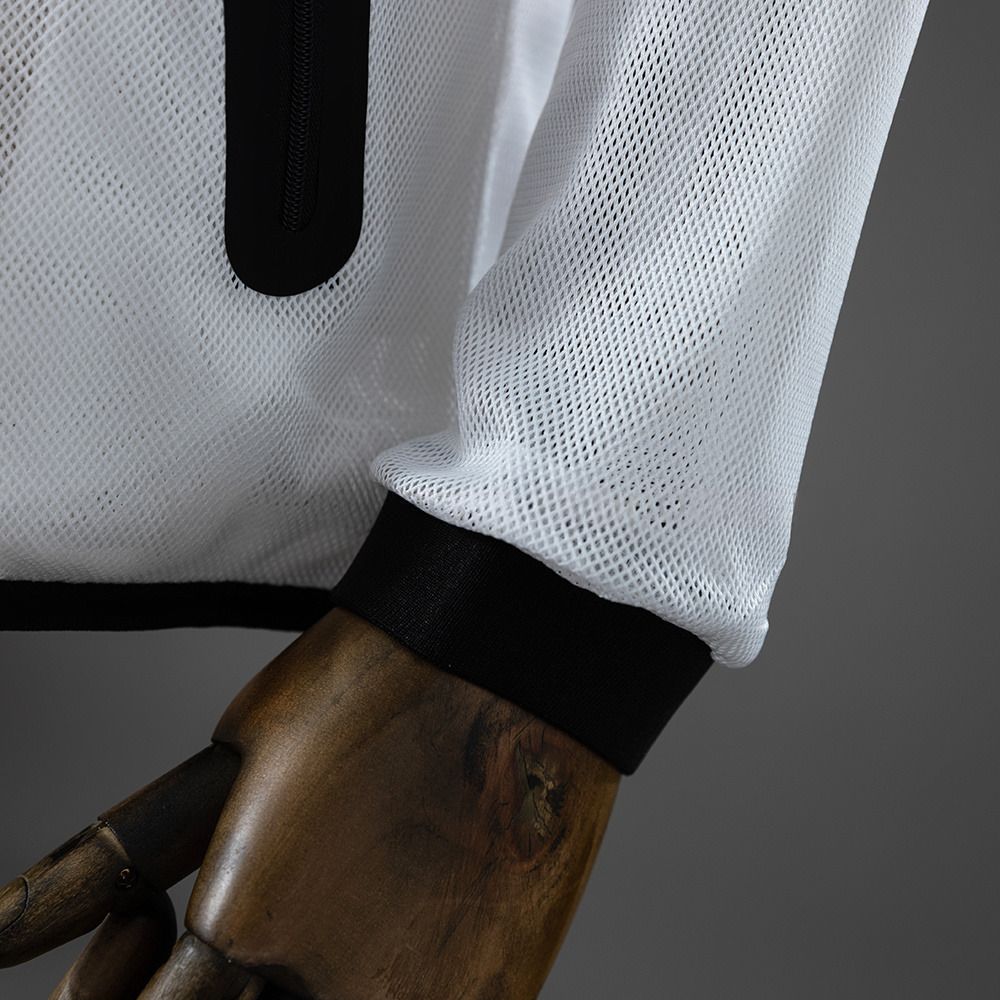 Den hvite basen med sorte detaljer skaper en skarp kontrast, med glidelås, lommer og designelementer som fremheves tydelig. Den karakteristiske V-formede linjen gir jakken et dynamisk uttrykk.