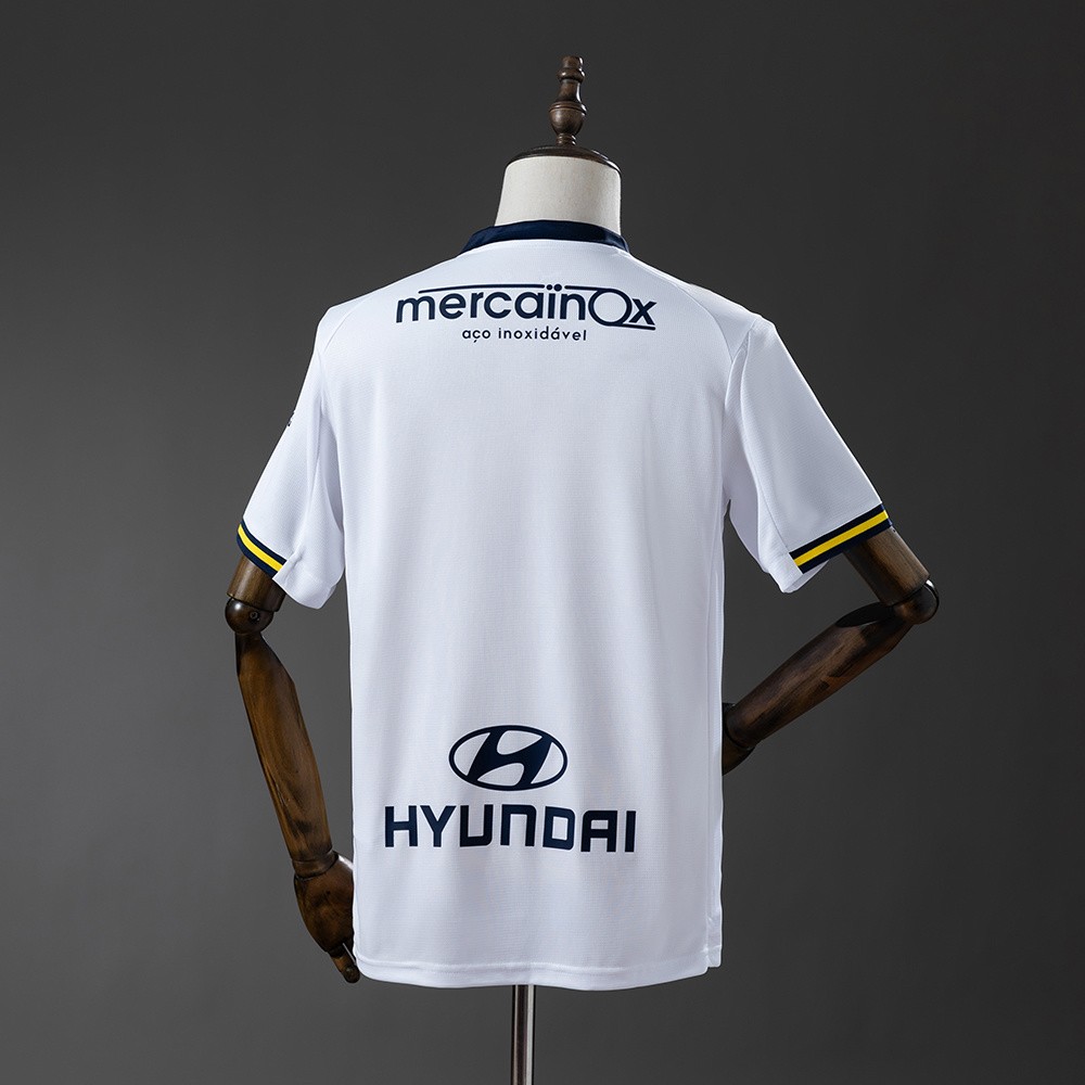 Vis din støtte for Vila Nova med den offisielle FC Famalicão hjemmedrakten for 2025-26. Denne sesongens design fra Puma kombinerer tradisjon med et moderne uttrykk. Drakten er hovedsakelig hvit, preget av en markant bred gul horisontal stripe og en elegant tynnere marineblå stripe over brystet.