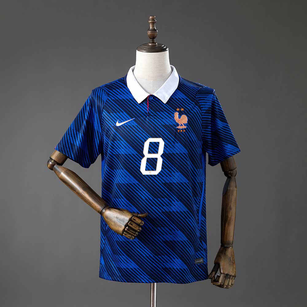 Denne drakten kombinerer den dype franske blåfargen med et moderne design av diagonale striper. Den klassiske hvite kragen gir et sofistikert uttrykk som passer perfekt både til kamp og hverdagsbruk.