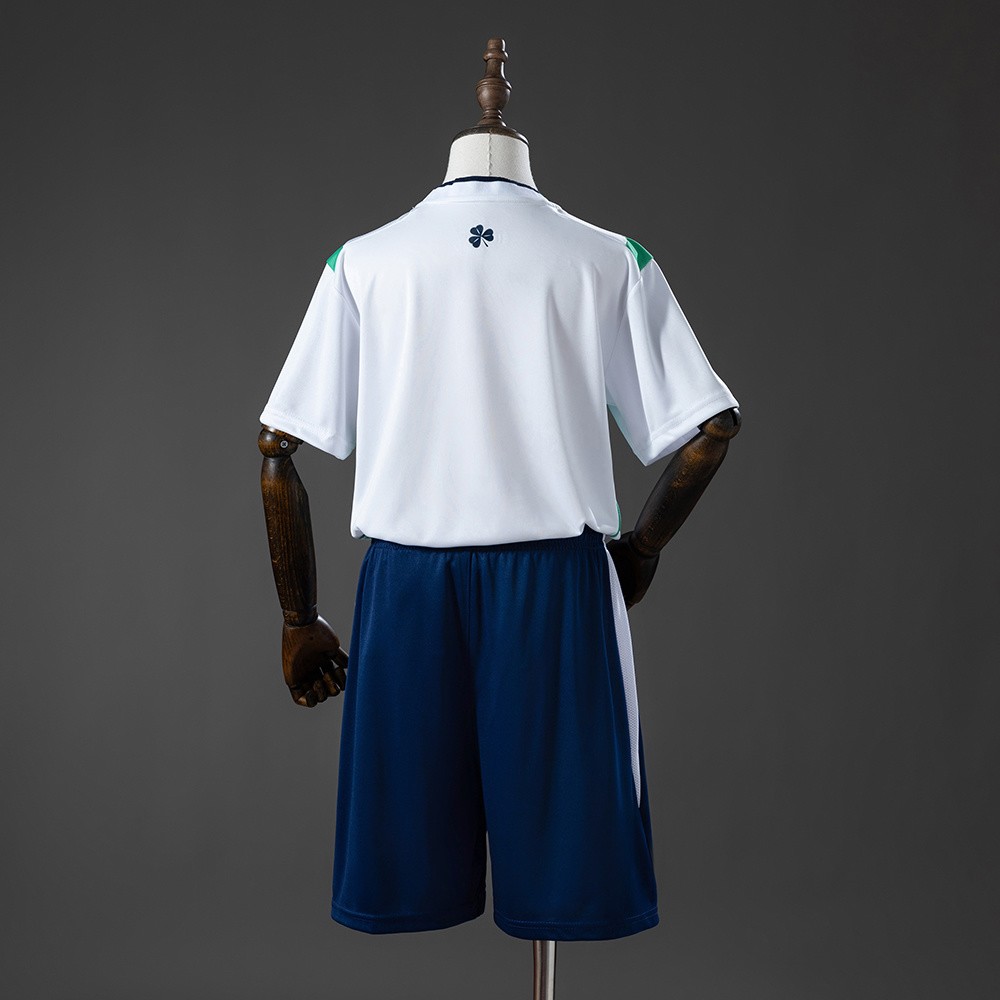 Irland 2026 bortedrakt barn er et komplett fotballdrakt sett med shorts, designet i en ren hvit base med moderne grønne mønstre. En frisk og moderne landslagsdrakt for VM 2026.