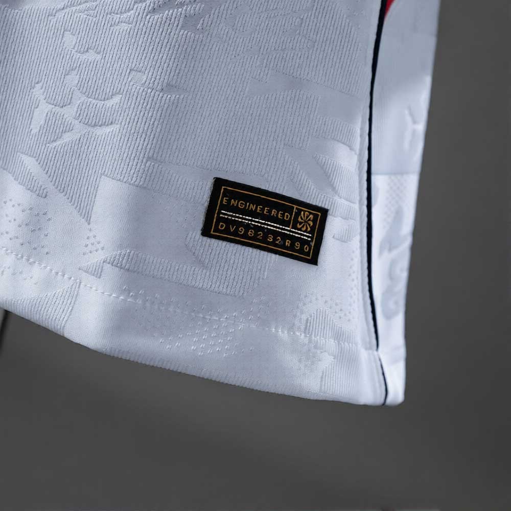 Den klassiske hvite basen kombineres med detaljer i rødt og mørk blått, noe som gir et rent og tidløst uttrykk. Dette gjør den til en av de mest populære VM 2026 drakter blant England-fans.
