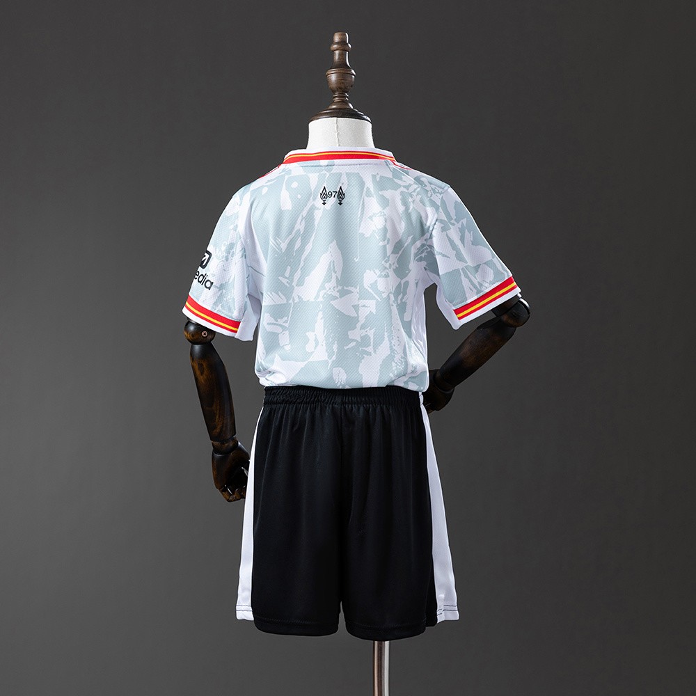 Gjør den lille «Red»-supporteren klar for kamp med det offisielle Liverpool FC 2024-25 tredjesettet. Dette unike settet for barn inkluderer både trøye og shorts, og kombinerer en klassisk hvit base med detaljer i «Pure Platinum», sort og «Global Red».