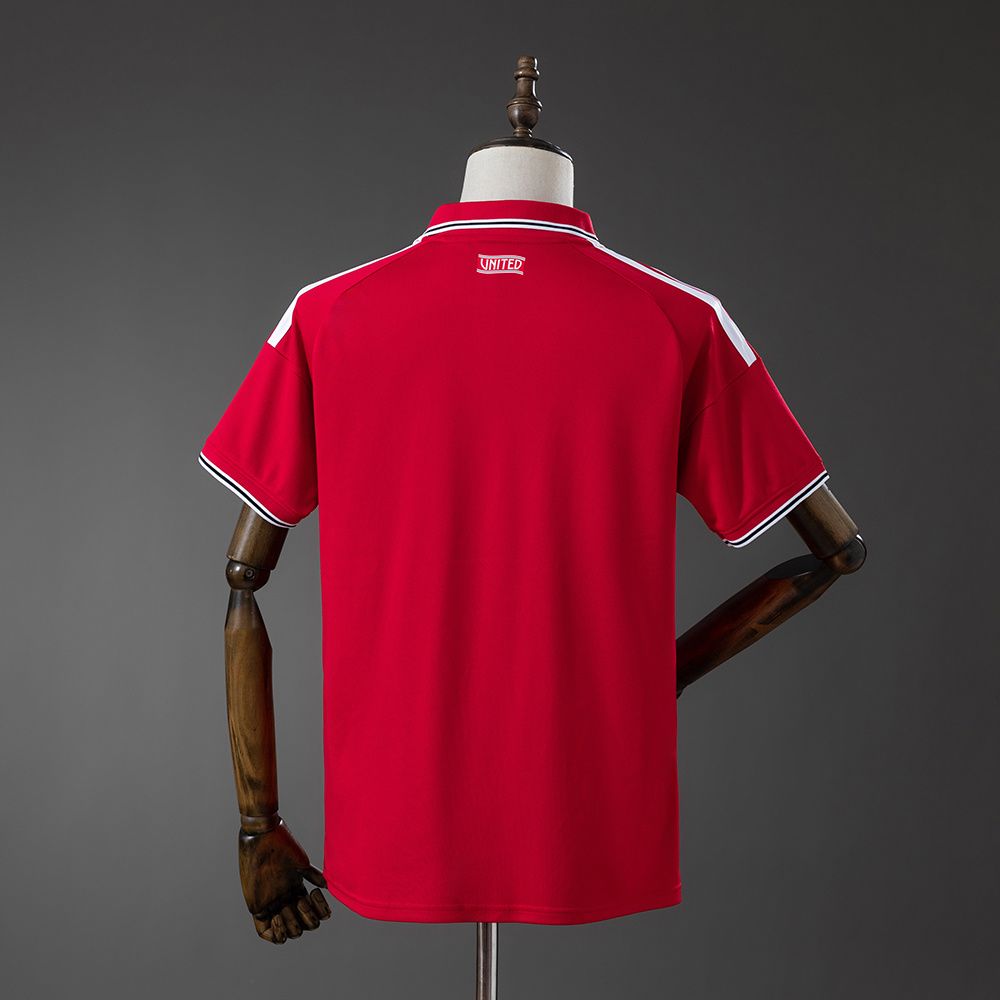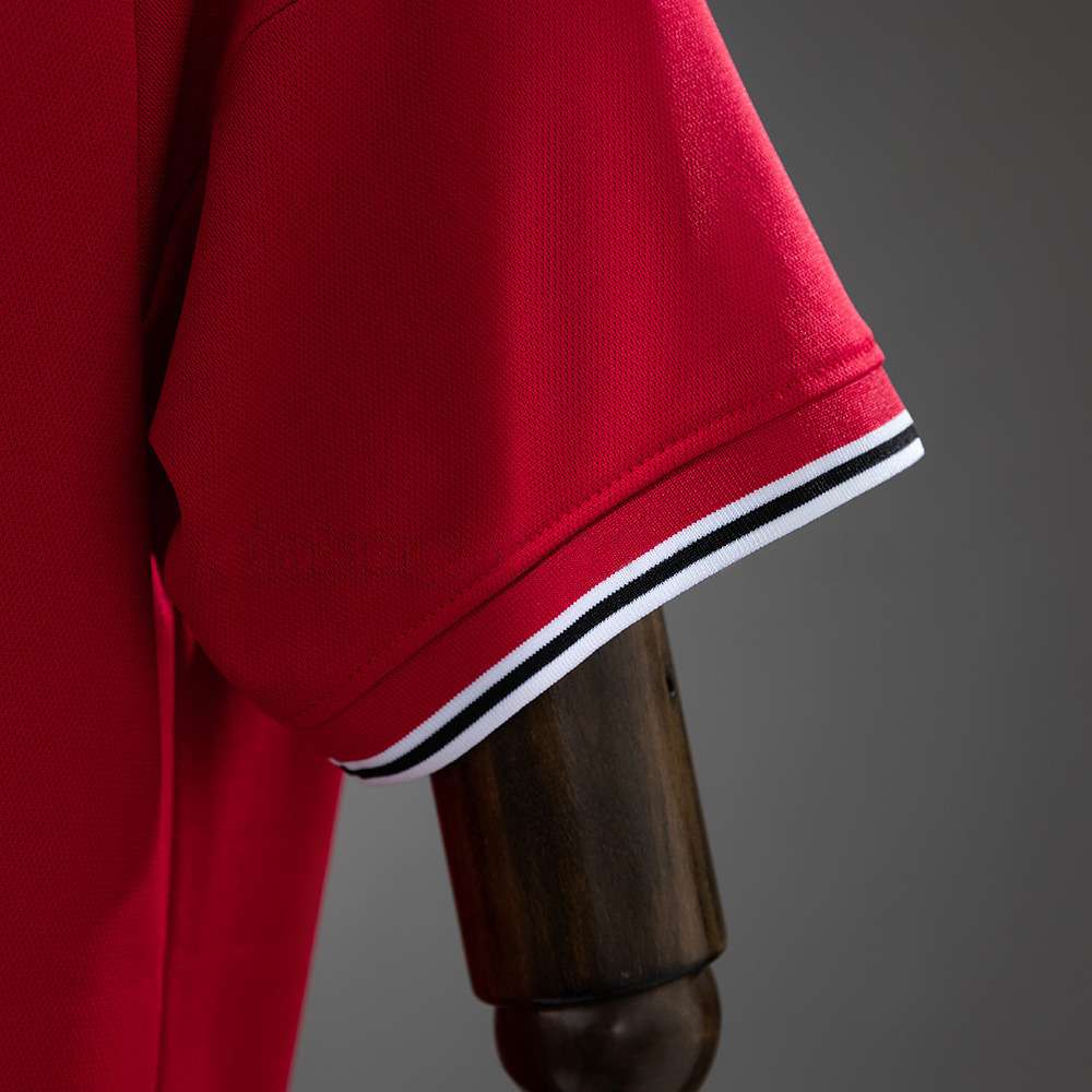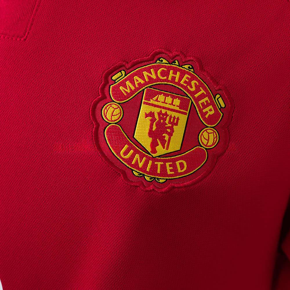 Drakten har den tradisjonelle røde basen, kombinert med hvite og svarte detaljer som gir et tidløst uttrykk. Dette er en stil som alltid forbindes med Manchester United.