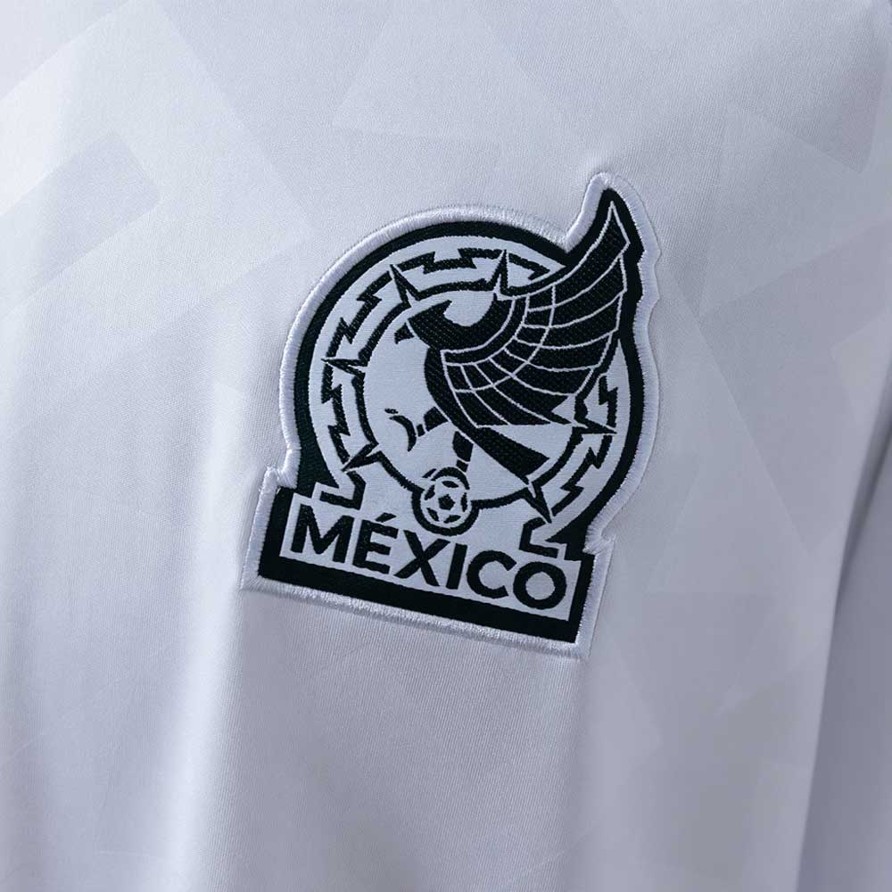 Mexico VM 2026 bortedrakten kommer i en ren hvit base, dekorert med et svært subtilt geometrisk mønster inspirert av eldgamle mesoamerikanske motiver. Mønsteret ligger ton-i-ton i stoffet og gir drakten et eksklusivt og kulturelt preg uten å være påtrengende.