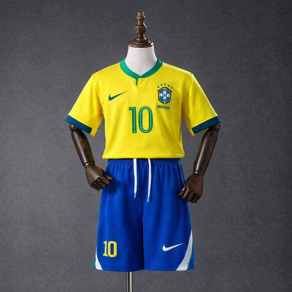 Blå elementer brukes i flere nyanser, både i detaljer og kontraster, og skaper dybde uten å ta fokuset bort fra den ikoniske gulfargen. Helheten gir et klart visuelt bånd tilbake til legender som Pelé, samtidig som drakten representerer dagens og morgendagens Brasil.