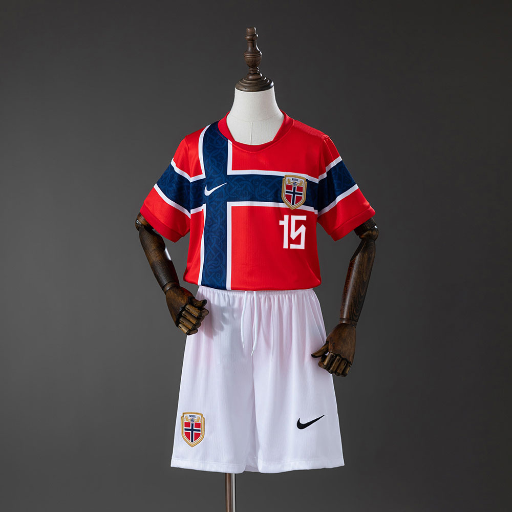 Gjør den neste generasjonen klar for VM 2026 med det offisielle hjemmesettet til det norske landslaget, ferdig trykket med Fredrik André Bjørkan (15). Denne drakten hyller den lynhurtige venstrebacken som den 31. mars 2026 startet i forsvarsrekka da Norge møtte Sveits på et kokende Ullevaal Stadion. Dette komplette settet er skapt for unge spillere som ønsker å kombinere Bjørkans offensive kraft med nasjonal stolthet når Norge endelig returnerer til VM-sluttspillet.