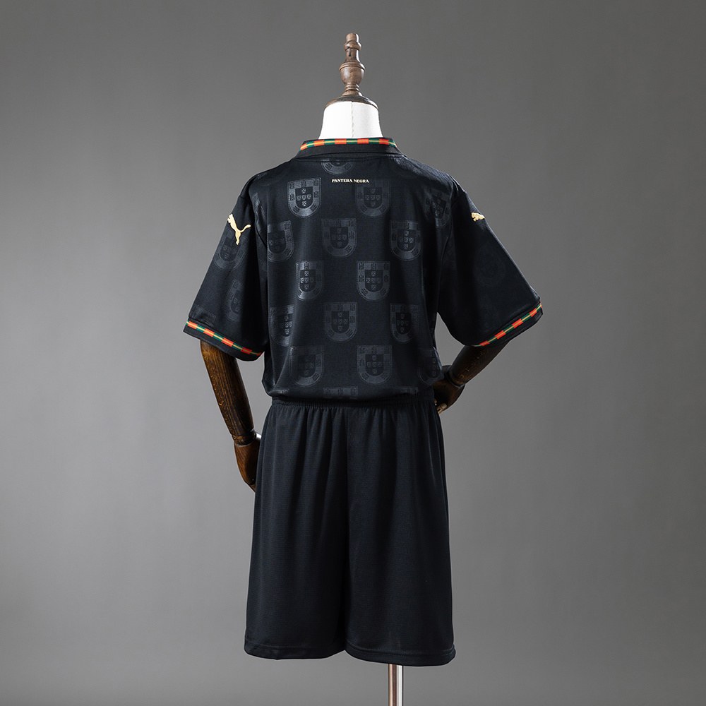 Portugal 2025 Special Edition draktsett for barn har et tøft sort uttrykk med subtile skjoldmønstre over hele stoffet. Gullfargede logoer og et tydelig landslagsmerke gjør drakten både kul og lett å kjenne igjen for unge fans.