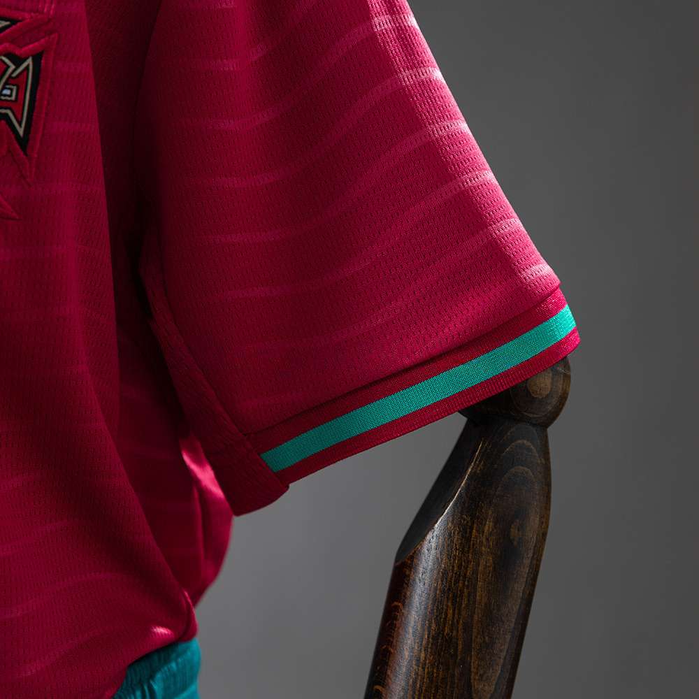 Kit Design: Maritim inspirasjon Designet på Portugals 2026-hjemmedrakt er hovedsakelig rødt med dype grønne aksenter. Den har et subtilt, bølgeinspirert grafisk mønster som representerer havet og Portugals historiske rolle som en ledende sjøfartsnasjon. De flytende linjene i stoffet symboliserer Atlanterhavets bevegelser.