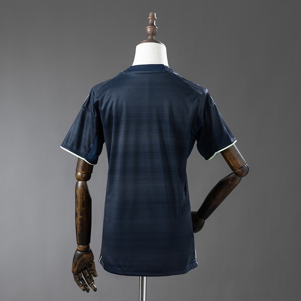 Drakten bygger på Tiro 25-utformingen og har en Teamgeist-inspirert krage som gir en tydelig og sportslig silhuett. Marineblå, sølv og volt skaper en visuell kontrast som gir drakten et uttrykk som skiller seg fra den tradisjonelle hvite hjemmevarianten.