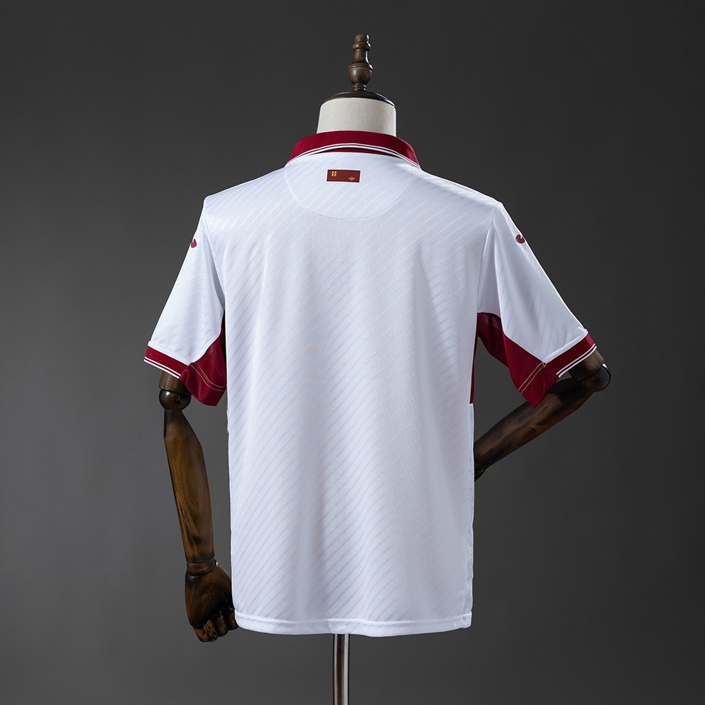 Real Murcia 25/26 bortedrakt kommer i et rent, hvitt uttrykk som brytes opp av vinrøde detaljer i krage, ermer og logoer. Fargekombinasjonen knytter drakten tydelig til klubbens identitet, samtidig som helheten fremstår lett, moderne og elegant.