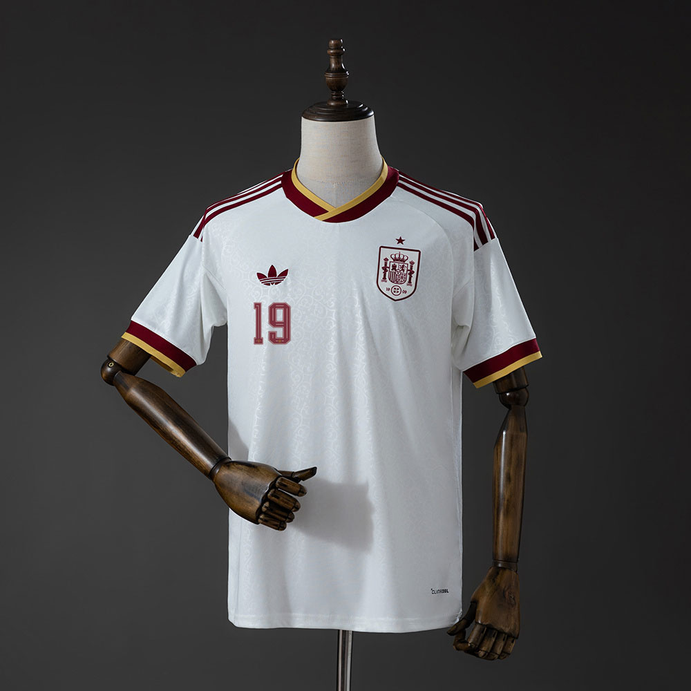 Dette er den offisielle Spania bortedrakten for VM 2026, komplett med Lamine Yamal 19 trykk på ryggen. Drakten kommer i en sofistikert «off-white» farge med detaljer i burgunder og gull. Dette er ikke en drakt for etterhåndstilpasning – den leveres med det offisielle navnet og nummeret til Barcelonas og Spanias supertalent ferdig påført, klart til bruk for alle trofaste supportere.