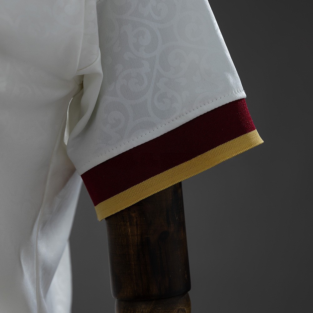 Drakten har en lys off-white base kombinert med burgunder og gullfargede detaljer, noe som gir et eksklusivt og sofistikert preg. Kragen og ermene er nøye designet med kontrastfarger som fremhever det klassiske uttrykket.