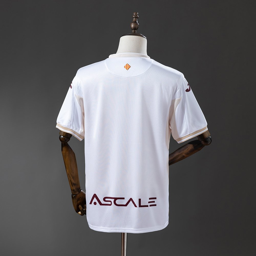 Kontrastene ligger i detaljene. Logoer, klubbemblem og sponsorelementer er utført i en dyp granatrød farge, som gir et markant visuelt løft og fungerer perfekt mot den lyse basen. Den samme fargetonen brukes også på shorts og sokker, slik at hele bortedrakten fremstår helhetlig og balansert.